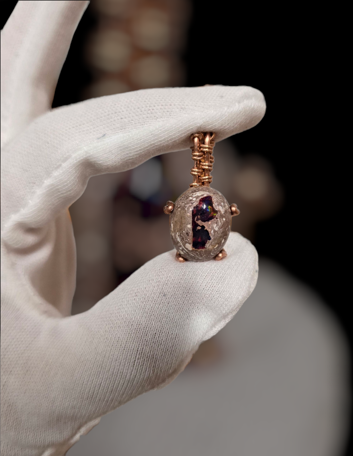 Mexican Fire Opal wrapped in copper wire: A vibrant gemstone with intense flashes of red, orange, and yellow, elegantly showcased in delicate copper wire wrapping. The transparent opal glows with inner fire, while the silver accents add a touch of sophistication and whimsy.